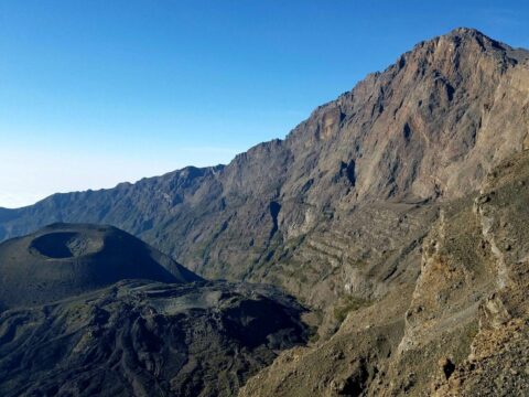 The route to the summit passes through parkland, mountain forest, a giant heather zone and moorland. Finally, the summit is reached by a narrow, barren ridge which provides stunning views of the Ash Cone lying several thousand feet below in the crater and Kilimanjaro in the background.